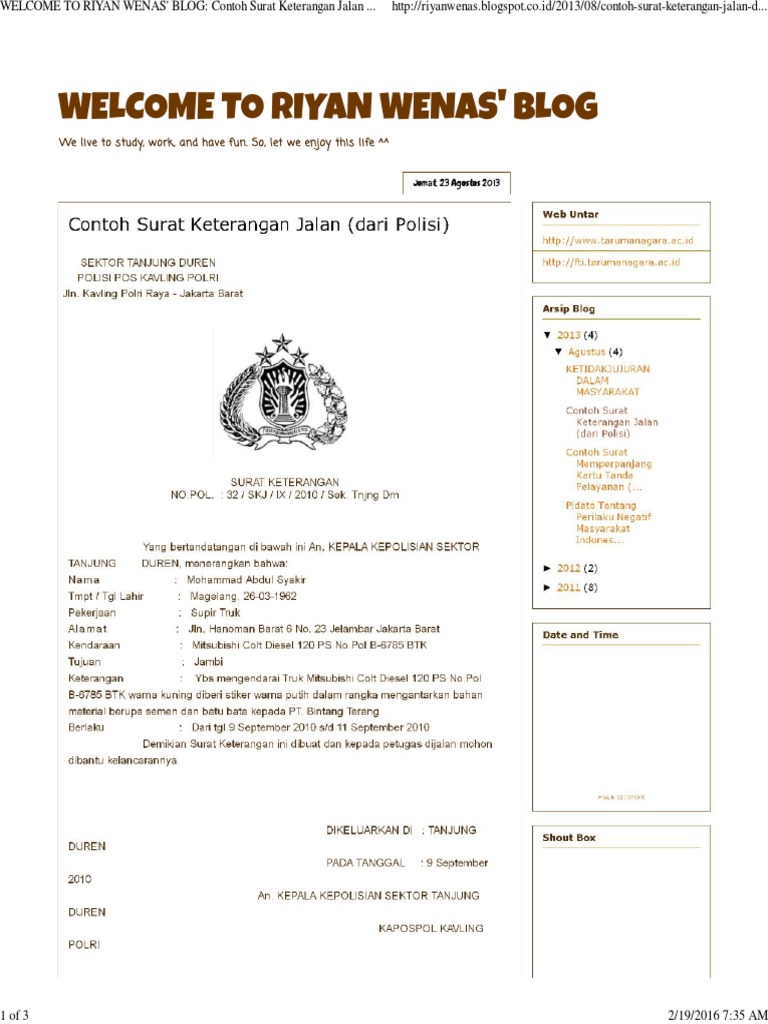 Surat jalan untuk perijinan orang maupun kendaraan umumnya dikeluarkan oleh suatu lembaga kepolisian maupun pemerintah desa. Kopi Penyemangat Menulis Surat Izin kepada kepolisian Terima kasih atas kesempatan anda mengunjungi blog ini. Pada hari ini tanggal 26 februari 2013.